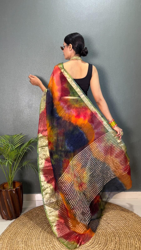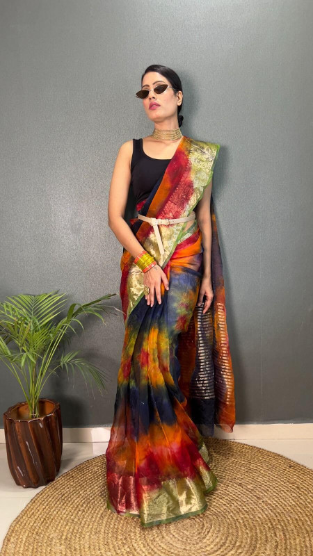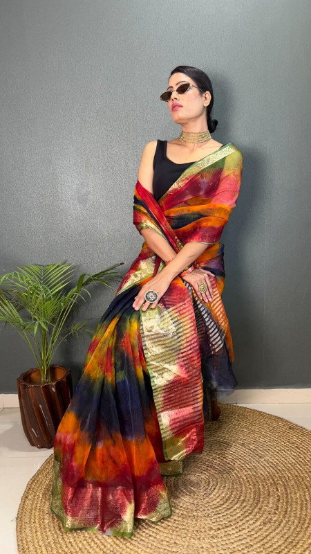 Soft Kora Organza saree with zari weaving and blouse. Perfect for weddings and festive wear. Lightweight, vibrant, and elegant.
