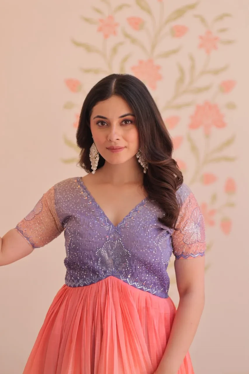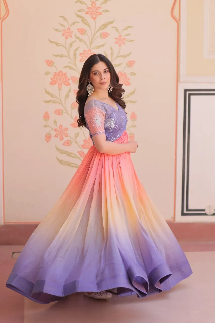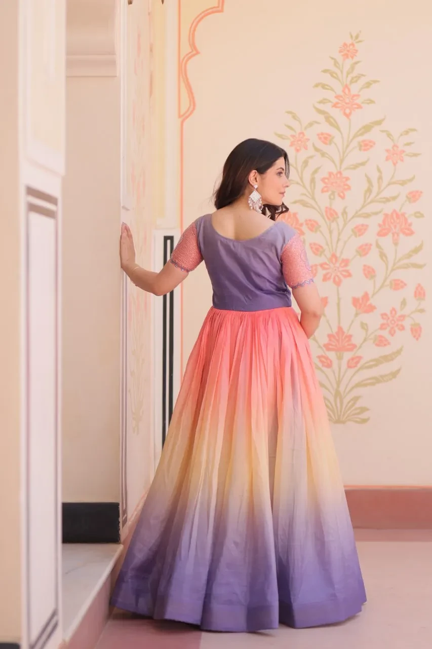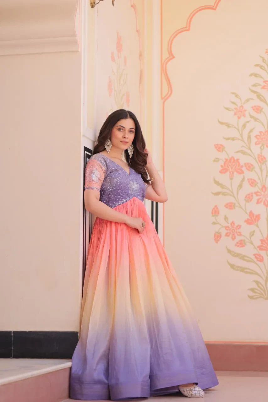 Elegant multicolor Anarkali gown with sequin work and V-neck, perfect for festive and party wear. Stylish, comfortable