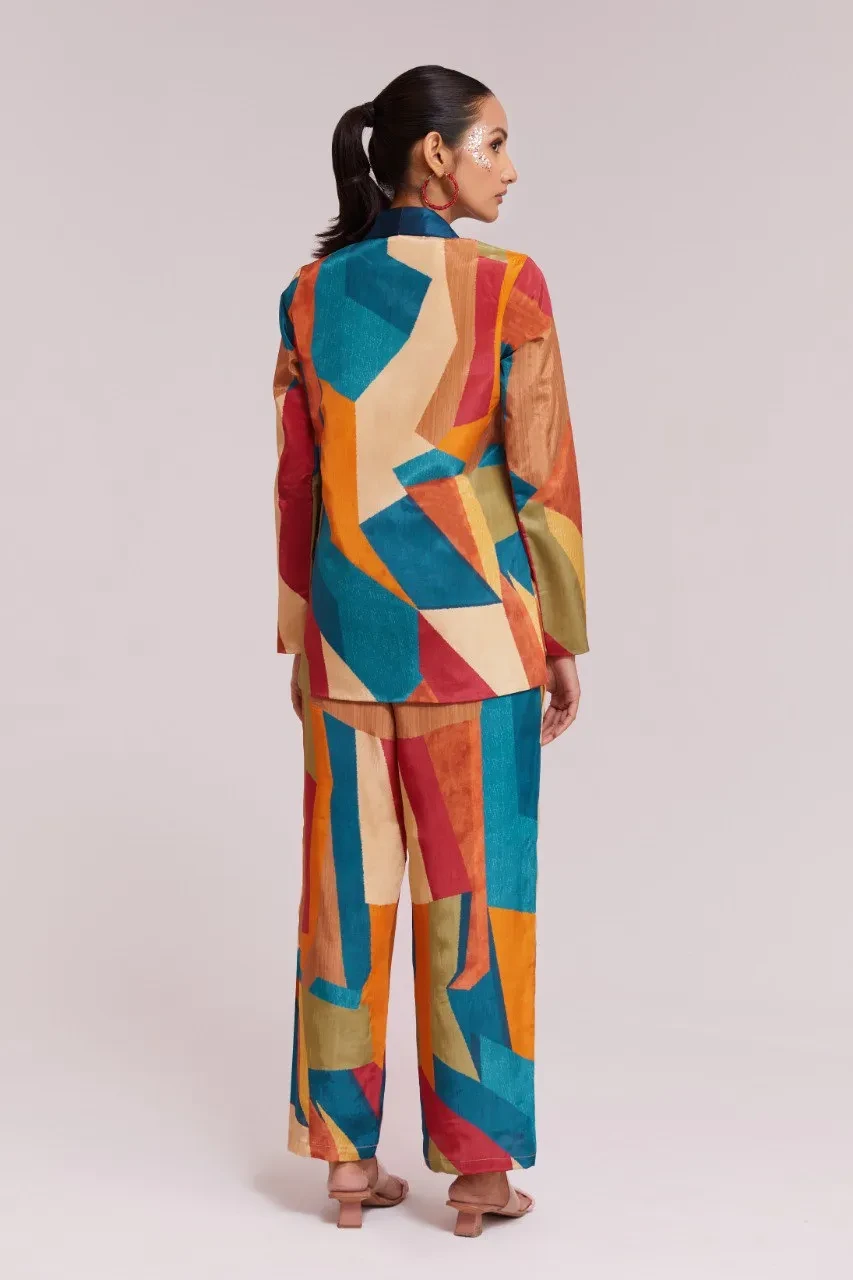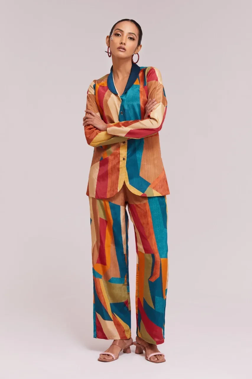 Step into bold, modern elegance with this multicolor crepe co-ord set featuring a striking printed blazer and matching wide-leg pants. Crafted in soft, lightweight crepe, this ready-to-wear ensemble is perfect for brunches, parties, and fashion-forward days. The set includes a stylish blazer with a classic collar and front buttons, paired with coordinated pants for a complete chic look.