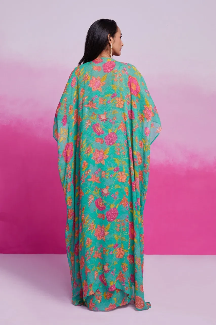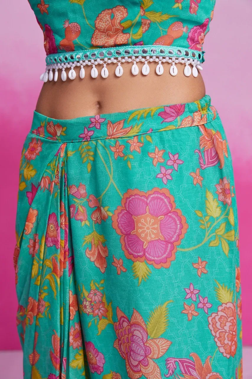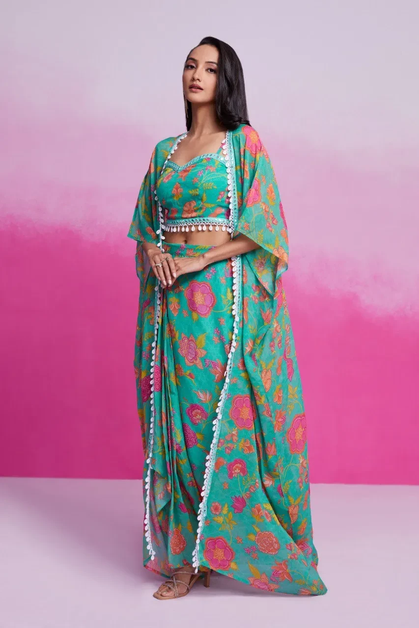 Effortless elegance with this beautifully designed turquoise co-ord set featuring a vibrant floral print. Crafted from lightweight georgette, the ensemble includes a sweetheart neckline blouse, a flared high-waist skirt, and a matching cape-style jacket. White embroidered lace trims and tassel detailing add a festive charm to this ready-to-wear outfit, perfect for summer weddings, festive events, or tropical getaways.