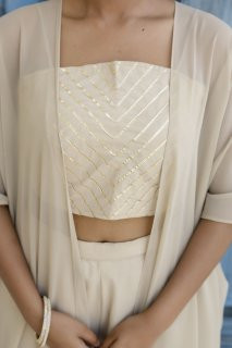 Glow in grace with this effortlessly chic ready-to-wear outfit designed in soft georgette. The set includes a fully stitched top with delicate gotta patti work, comfortable palazzo pants lined with micro cotton, and a breezy shrug that adds sophistication to your look. Ideal for festive wear, parties, and elegant outings, this coordinated set blends comfort with timeless style. Available in all standard sizes.