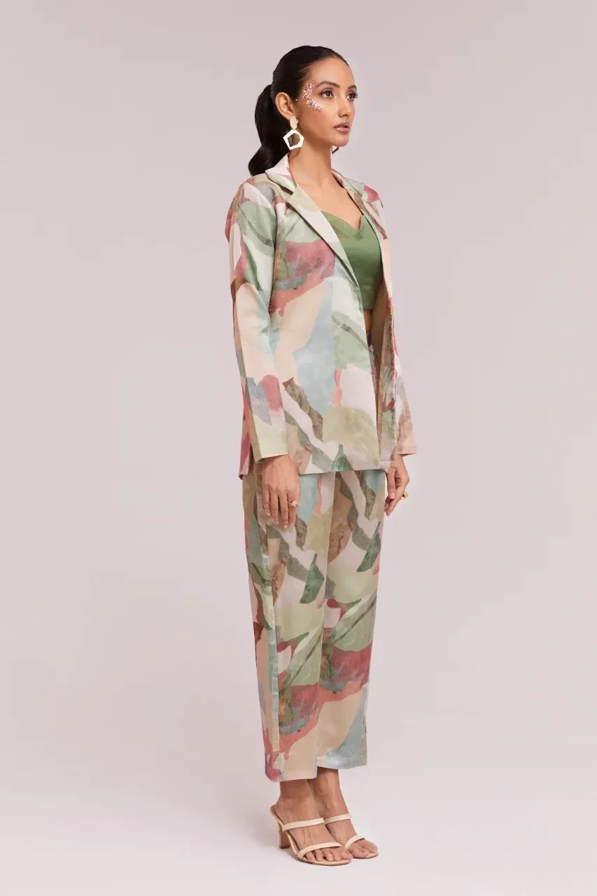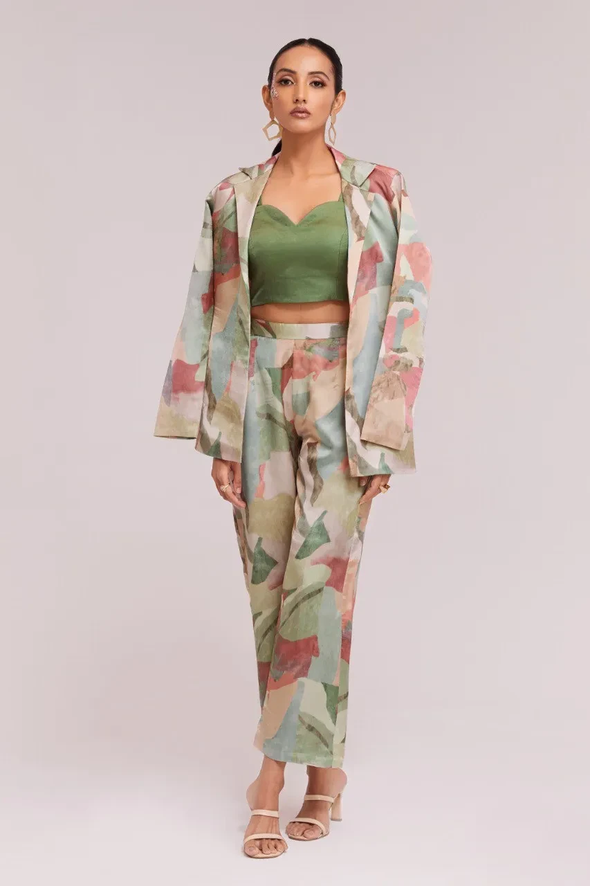 Turn heads with this statement 3-piece co-ord set designed for the stylish and modern woman. Featuring a tailored printed blazer, sweetheart neckline crop blouse, and matching wide-leg trousers, this outfit is perfect for day brunches, resort getaways, or high-street chic outings.