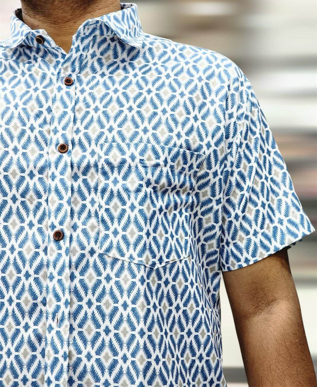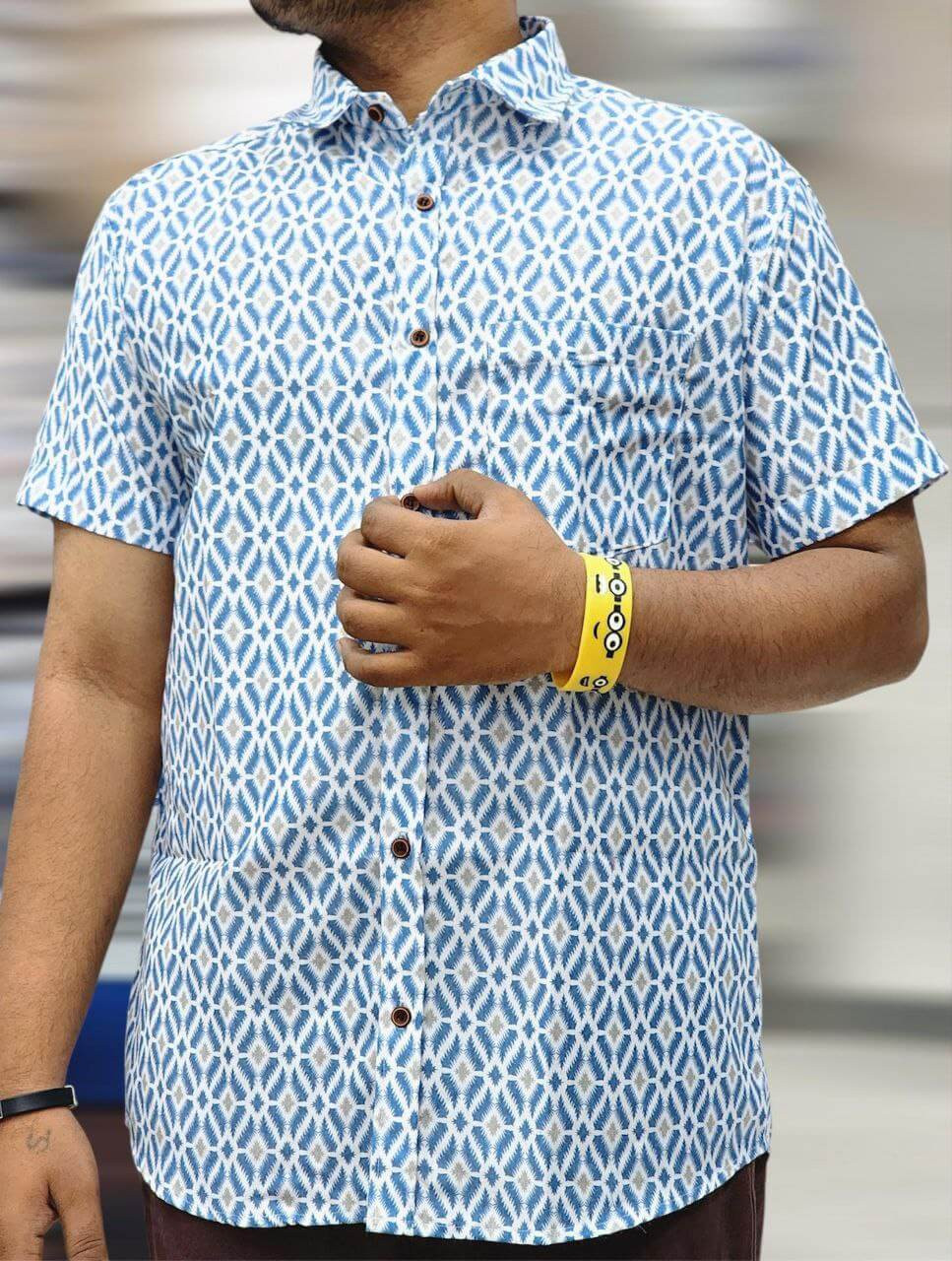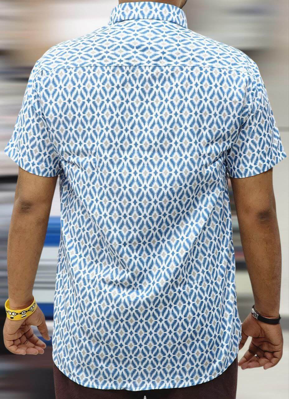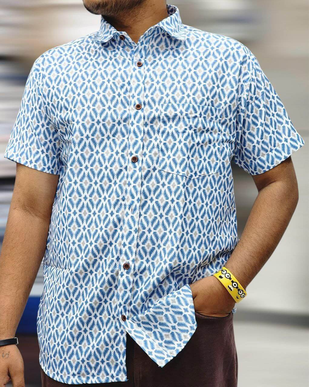 Exclusive men's printed cotton shirt. Crafted from soft, breathable cotton fabric, this shirt features a geometric ikat-inspired print in shades of blue and white, making it perfect for casual outings, office wear, or festive occasions. The half-sleeve design and slim collar give it a modern edge, while the natural button-down finish adds a refined touch. Stay stylish and comfortable all day long!